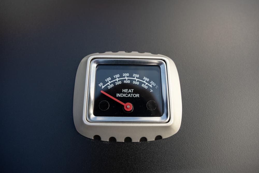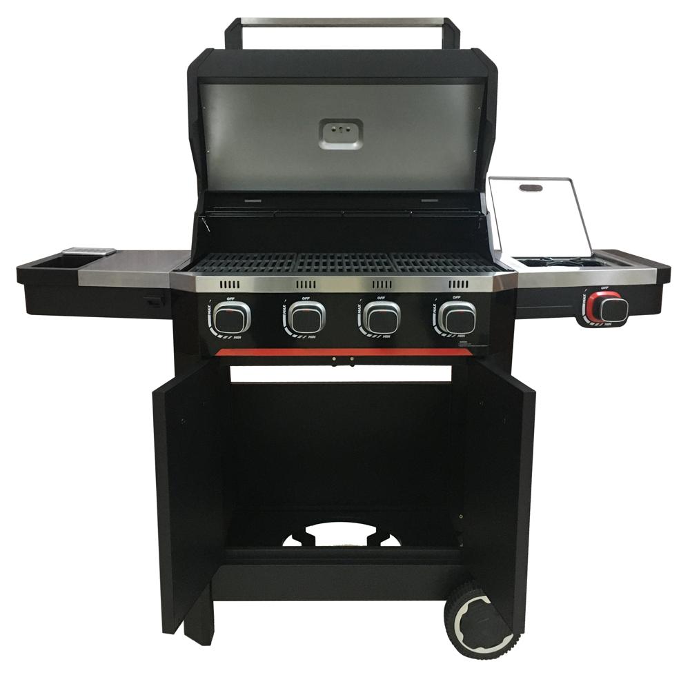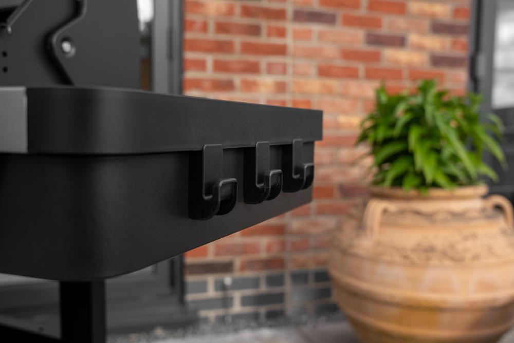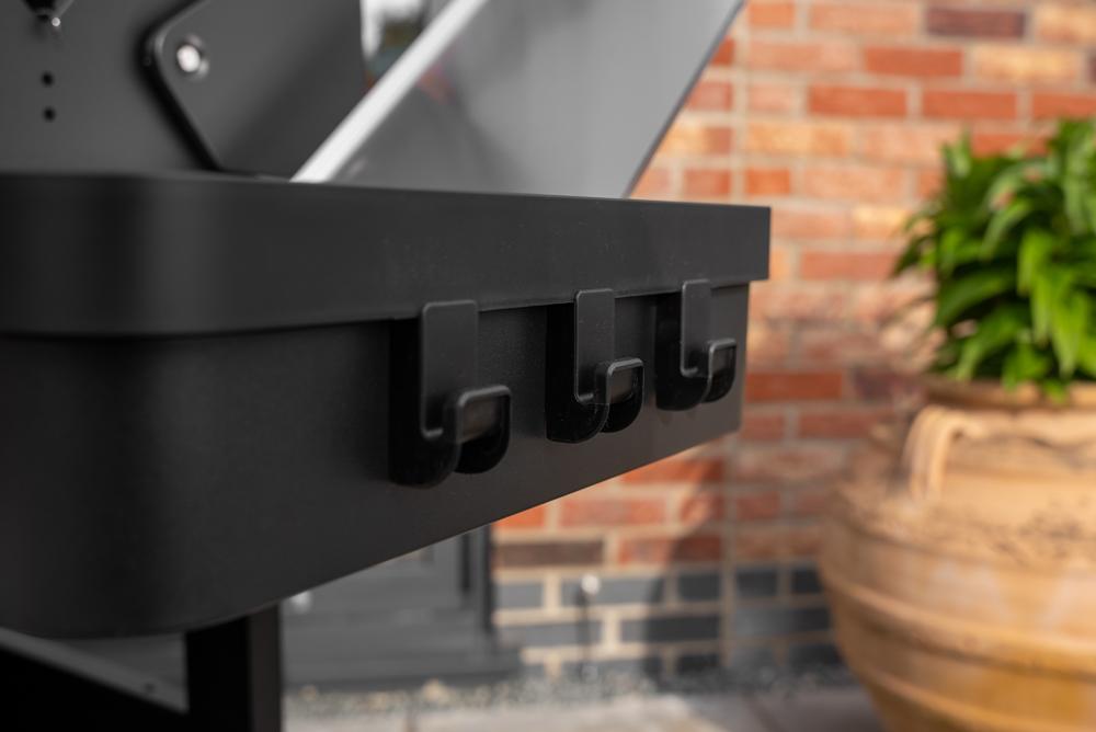 - Built in thermometer and side table as well as a handy condiment tray and hooks with a spacious and convenient storage cabinet.