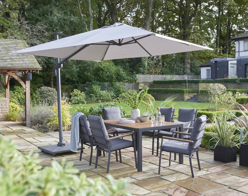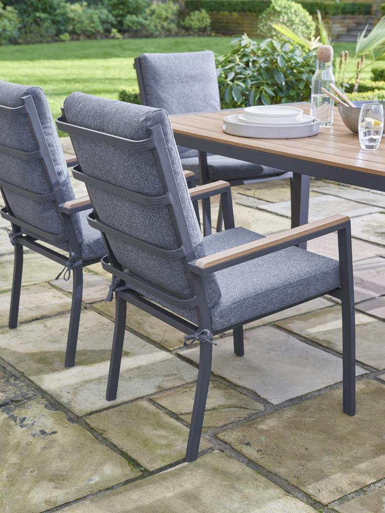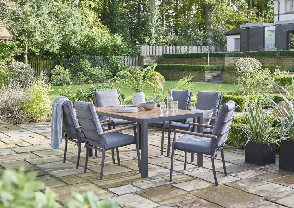 - Introducing the Easton 6 Seater Dining Set - a sleek and durable outdoor ensemble designed for your dining and relaxation needs. With a modern and sophisticated Beige frame and 160x100cm table with a Teak Look Poly Wood top and sides makes this an attractive and robust surface for your outdoor dining and entertaining. The set includes beige seat and back cushions adding comfort and style to your outdoor dining and relaxation experience.
