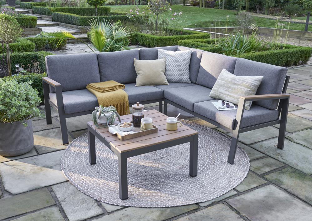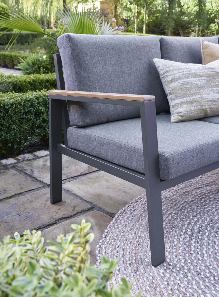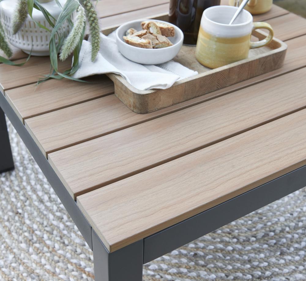 - Introducing the Easton Mini Corner Set - a stylish and space-efficient outdoor ensemble designed to enhance your comfort and relaxation. With a modern and sophisticated beige frame, the 70x70cm table with Teak Look Poly Wood top and side armrests offers a visually appealing and practical surface for your outdoor essentials. The Teak Look Polywood Table top and Arm Rests not only add an elegant touch but are also designed to endure outdoor conditions, making them both stylish and functional. Beige cushions complete the set, providing comfort and style for an inviting and cosy outdoor experience.