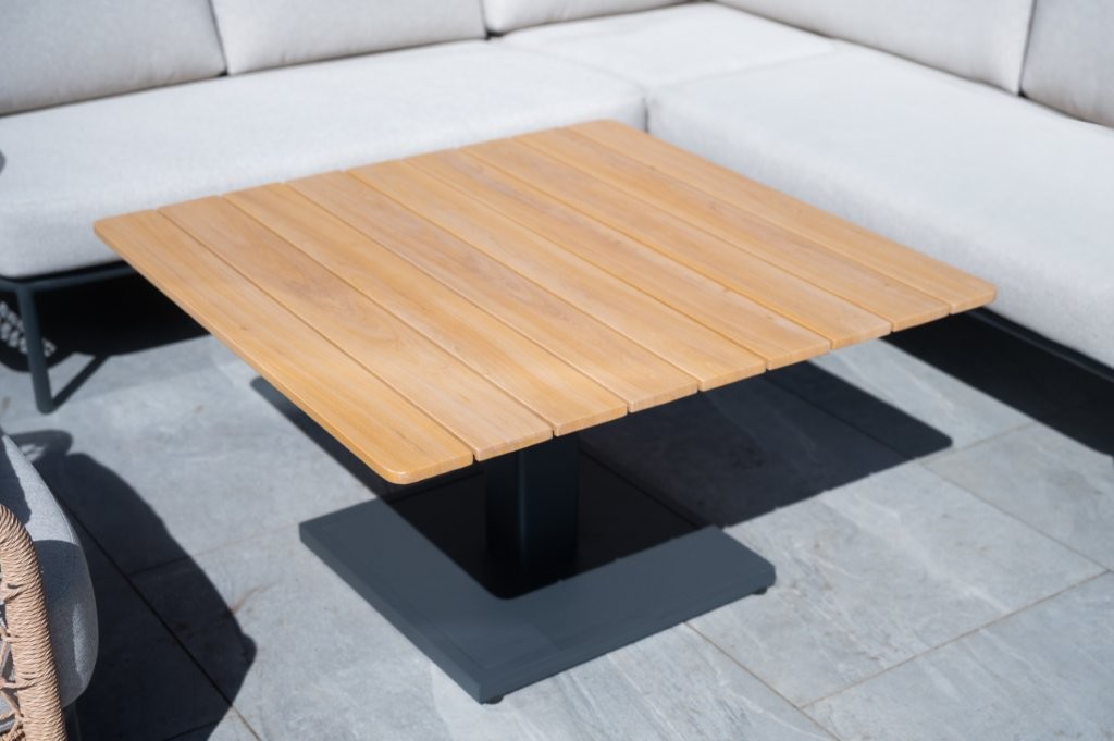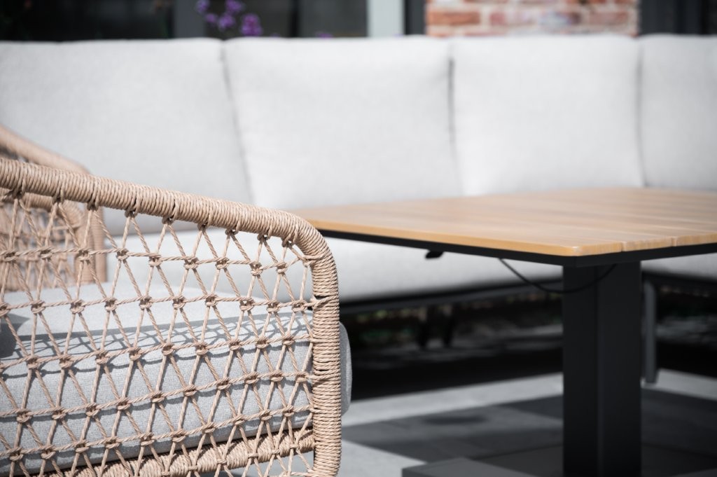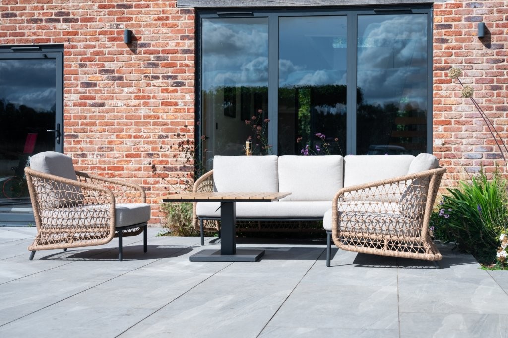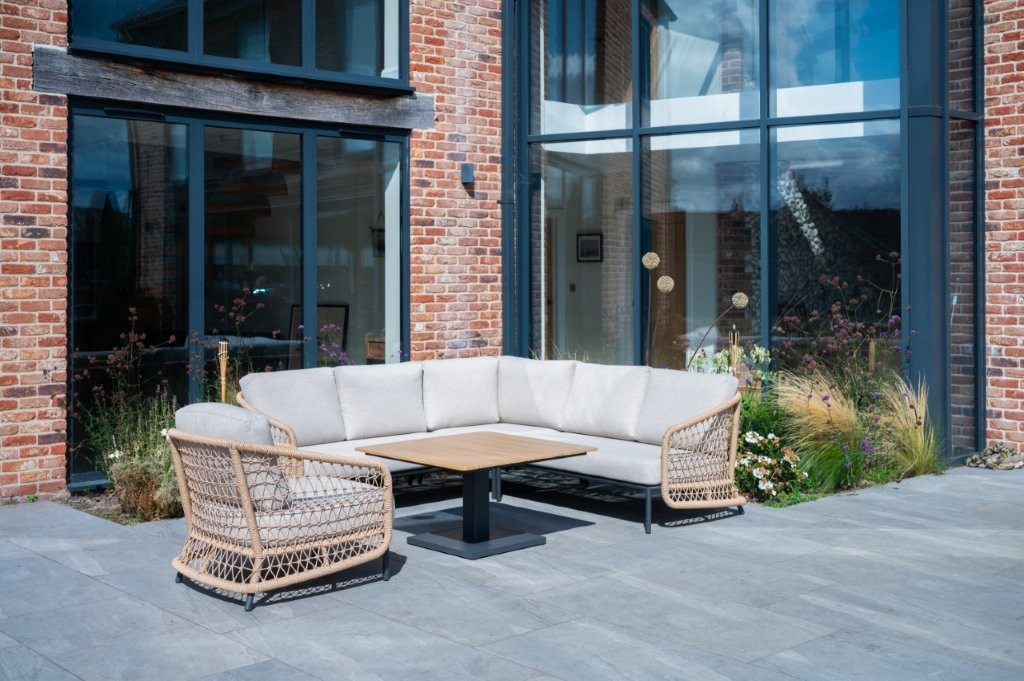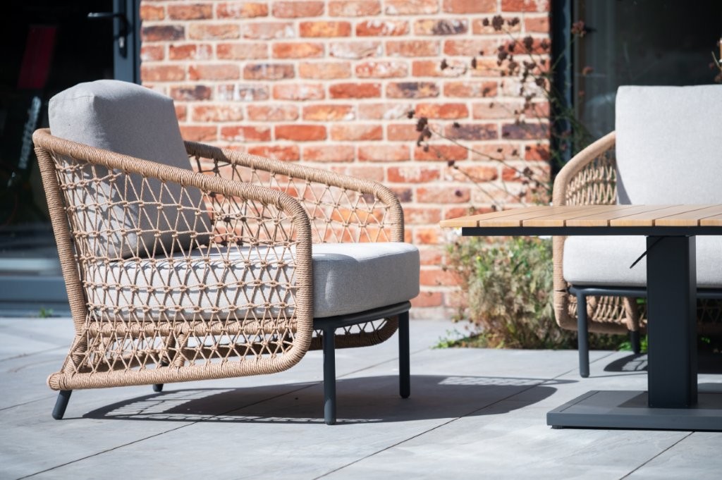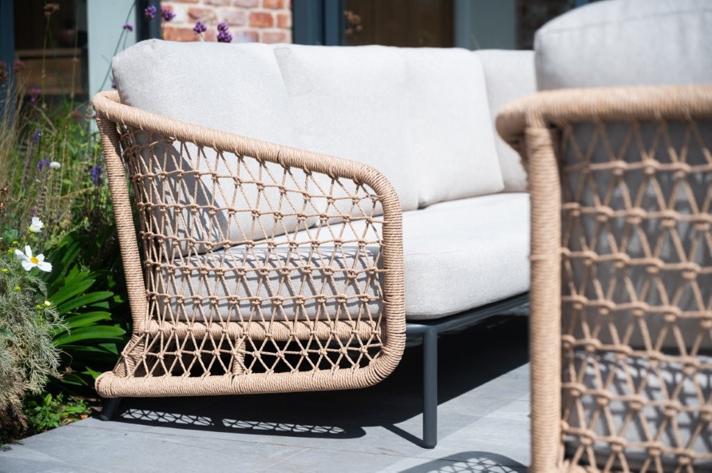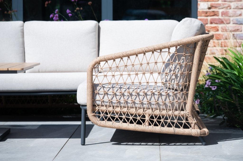- Powder-coated aluminium framing wrapped with twisted wicker poly-weave in the armrests for an open weave style.