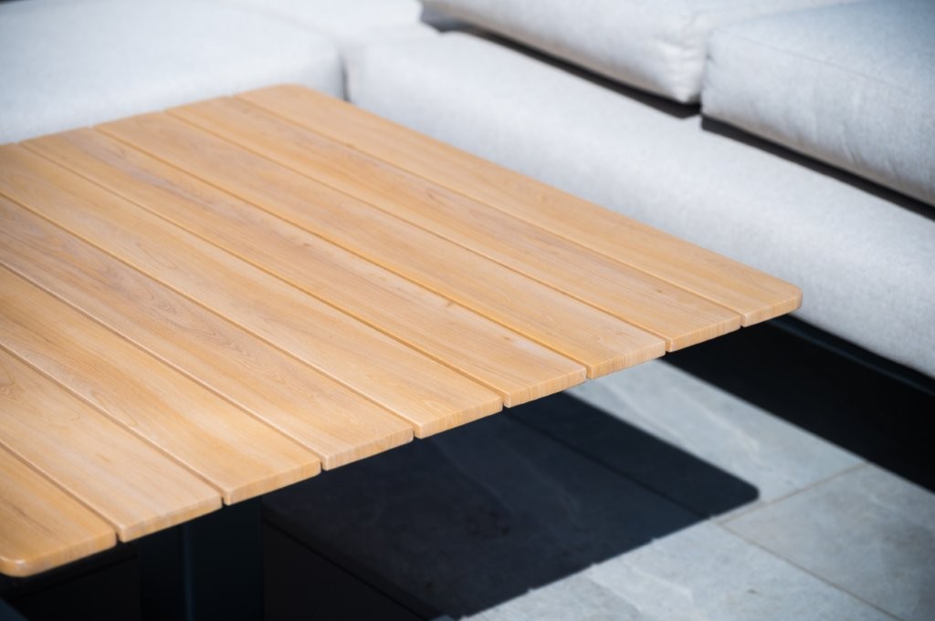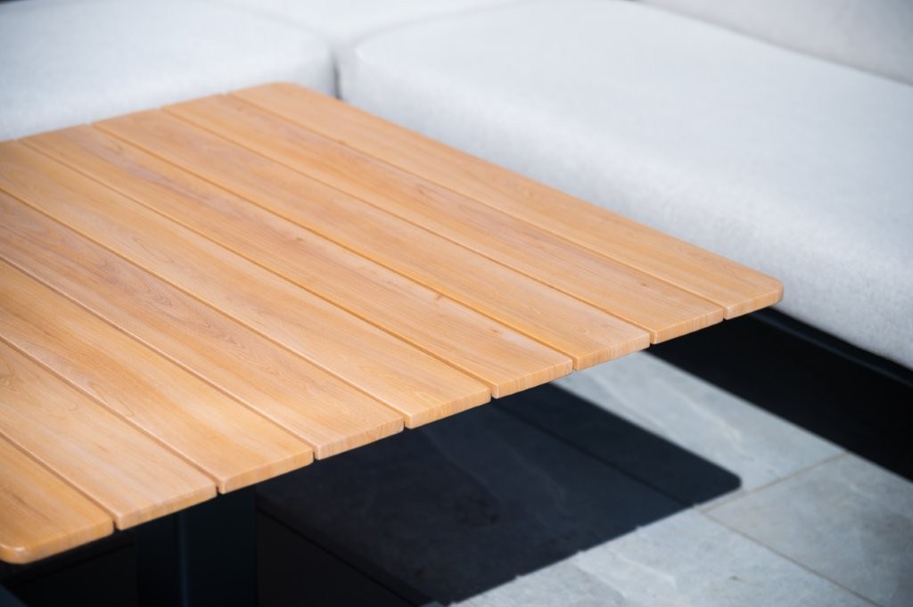 - A gas powered height adjustable table made with wood-imitation aluminium table slats.