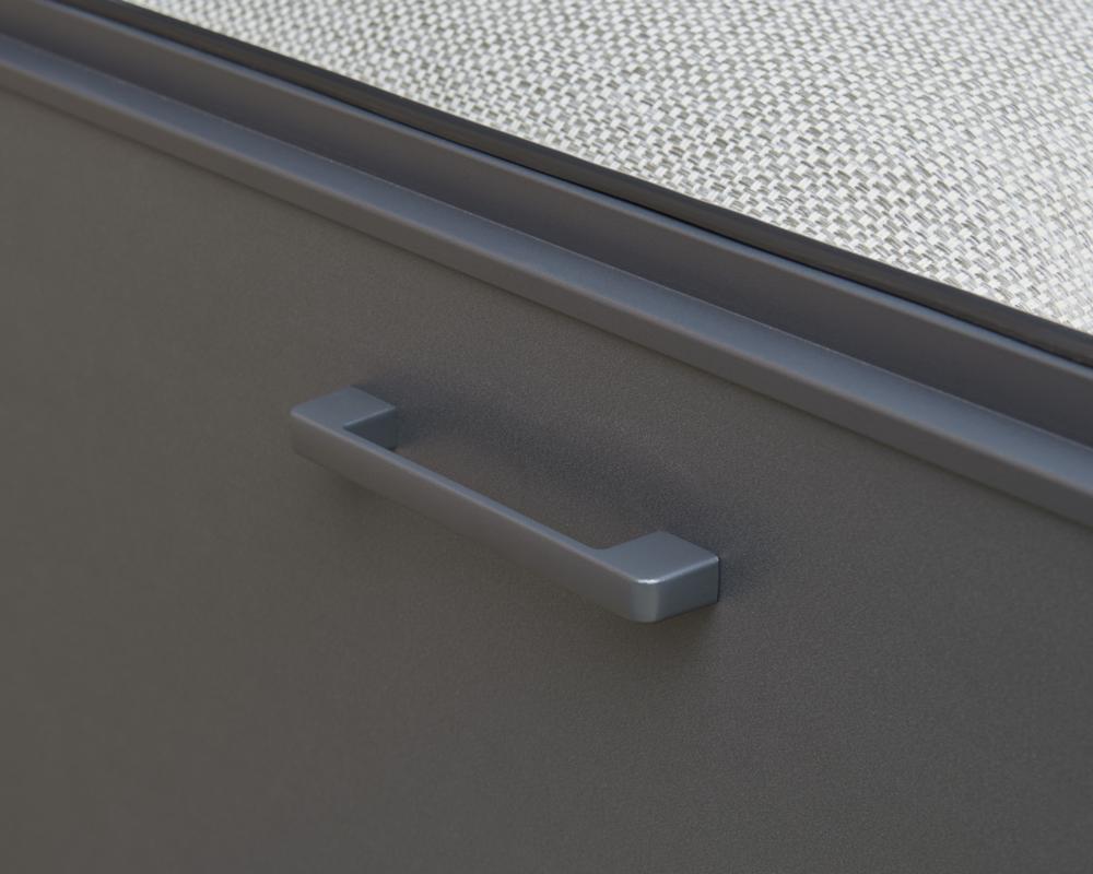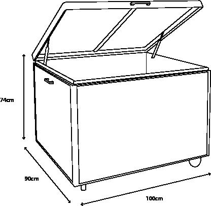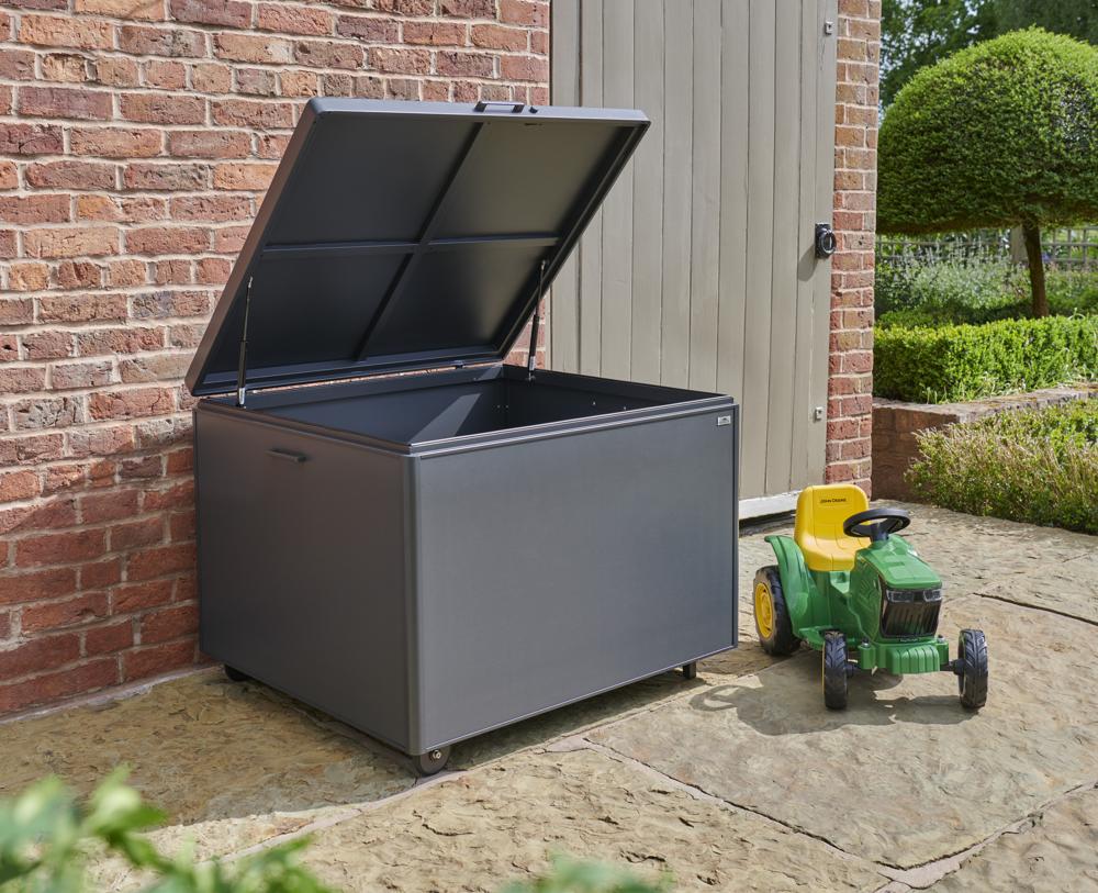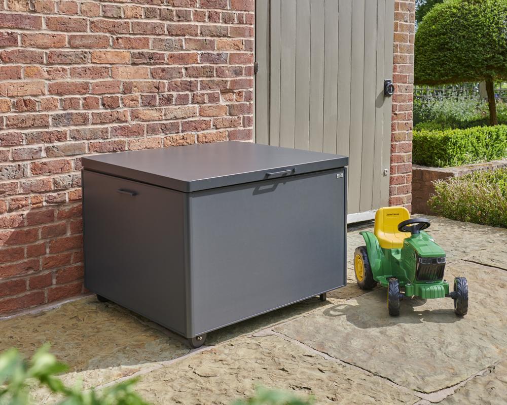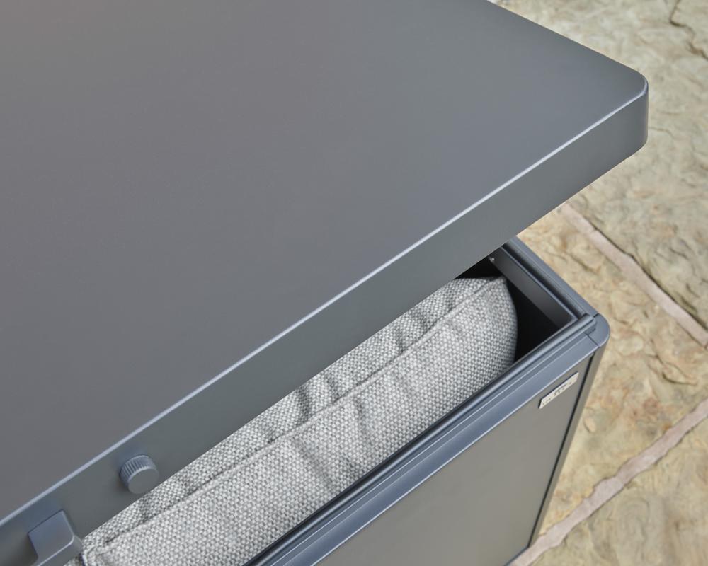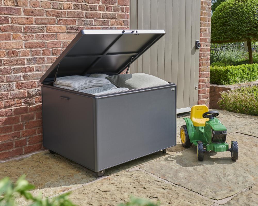 • Storage box features a piston-assisted lid for smooth opening and closing, integrated side handles, and built-in wheels for easy manoeuvrability.
