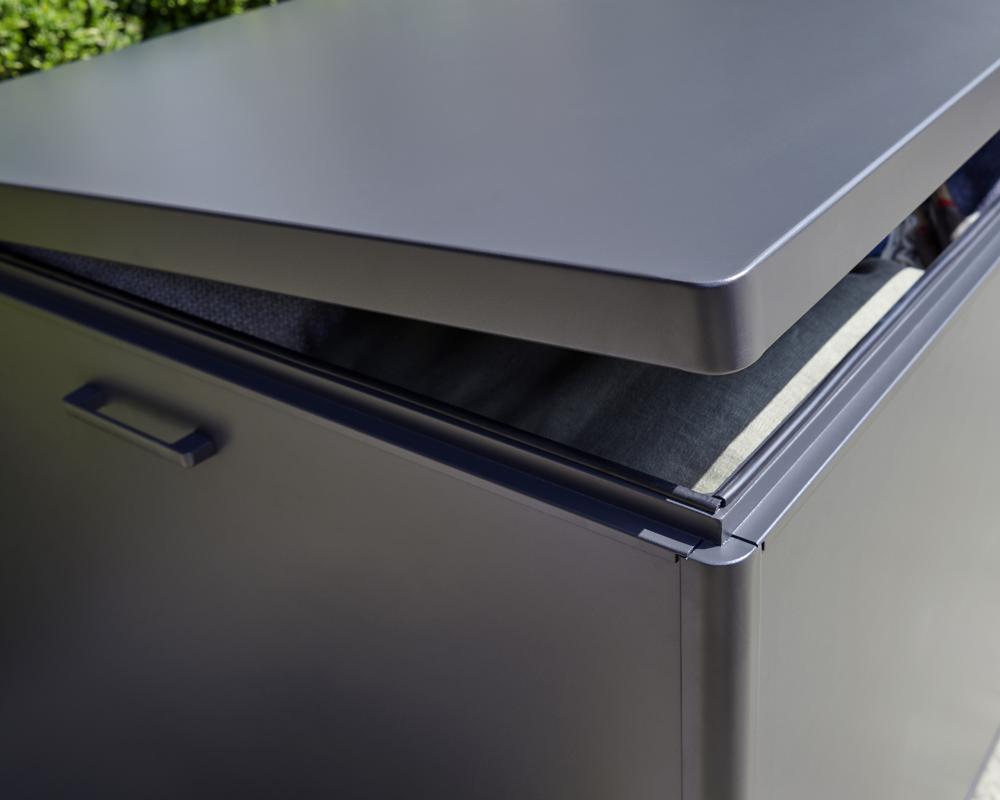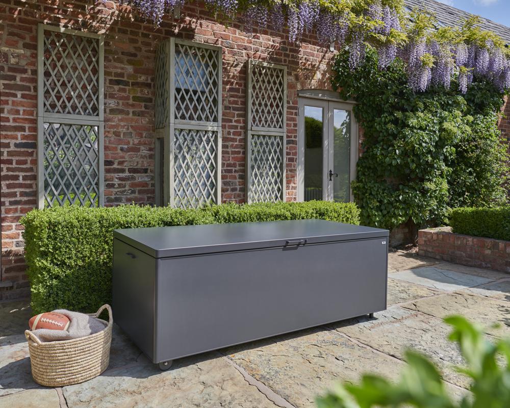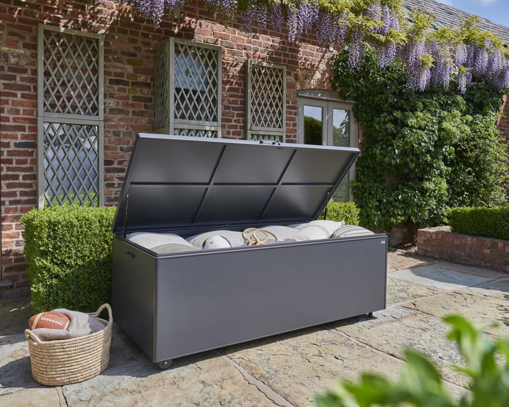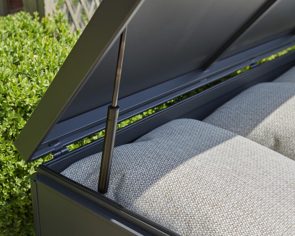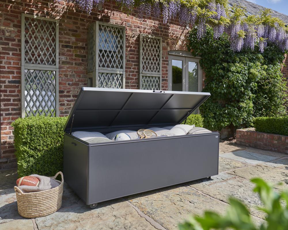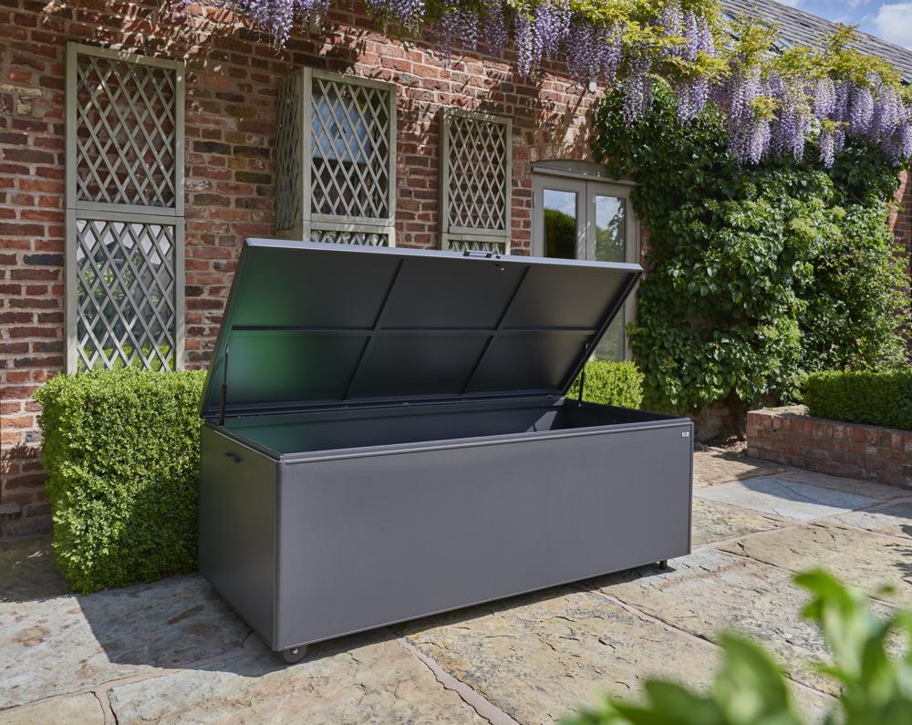 - Storage box features a piston-assisted lid for smooth opening and closing, integrated side handles, and built-in wheels for easy manoeuvrability.