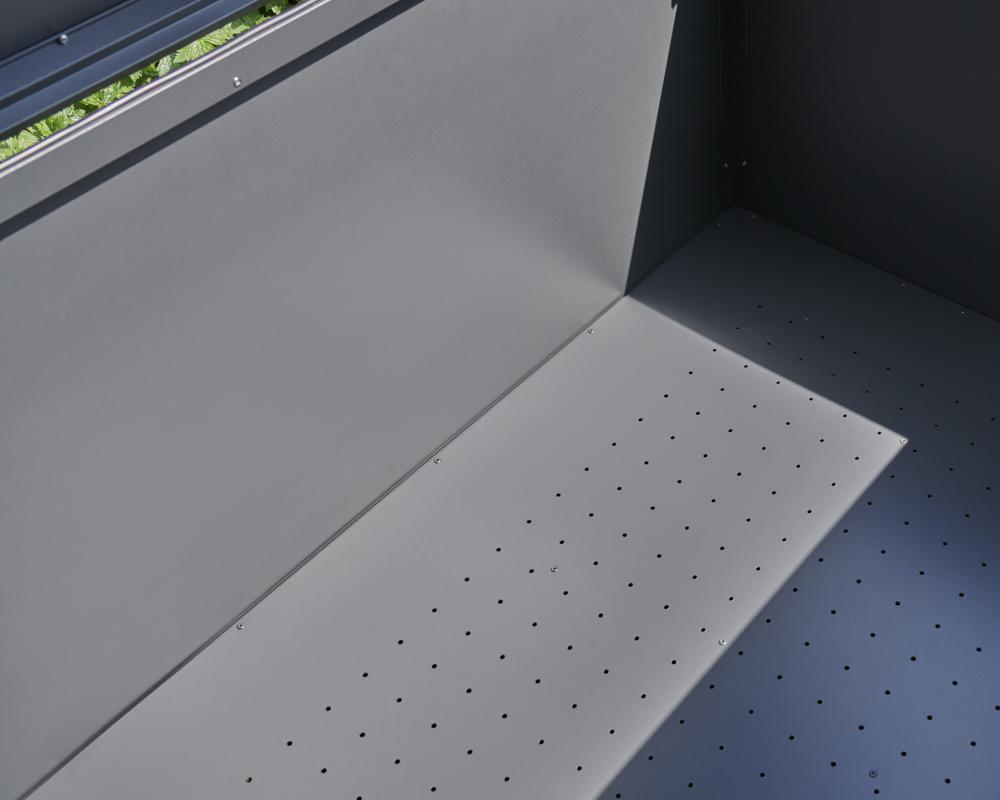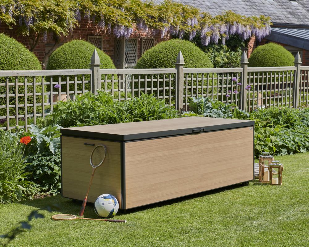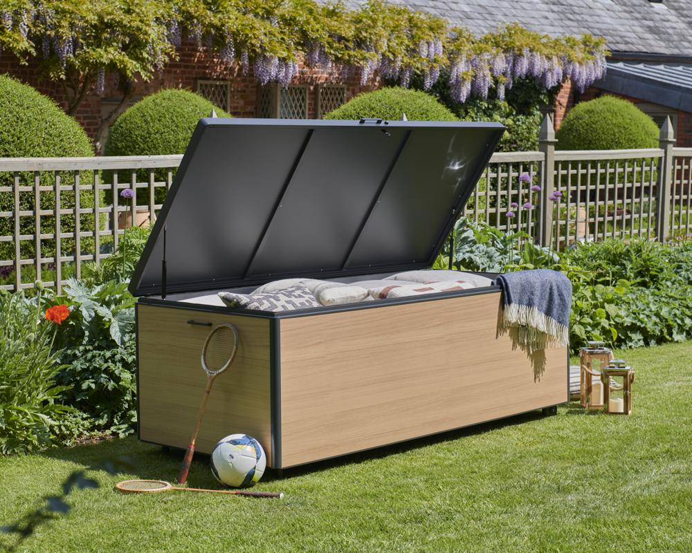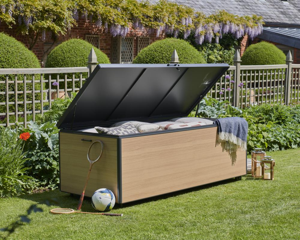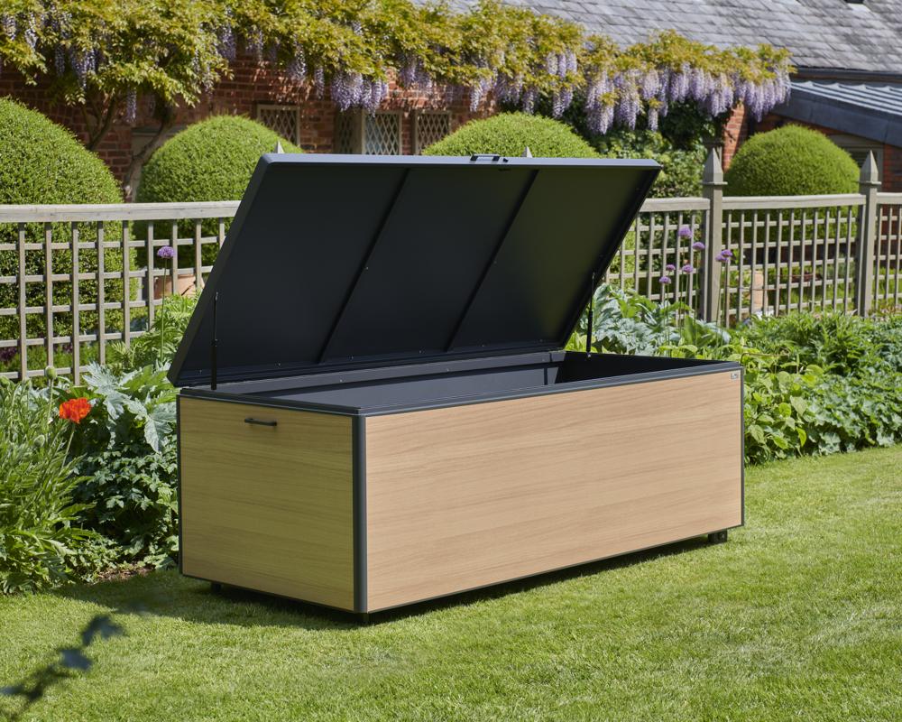 - Storage box features a piston-assisted lid for smooth opening and closing, integrated side handles, and built-in wheels for easy manoeuvrability.