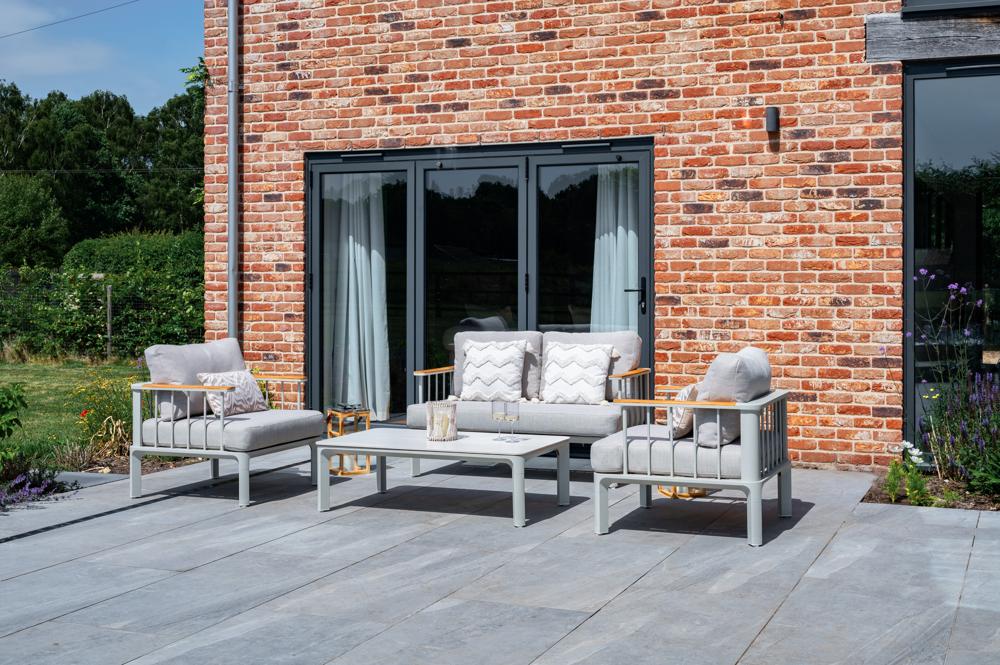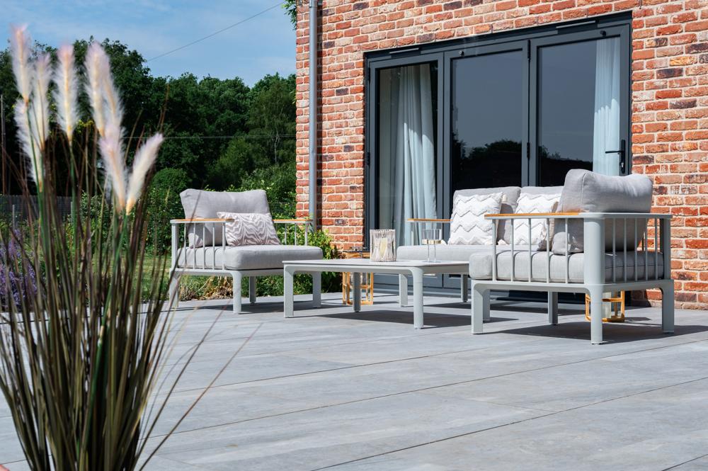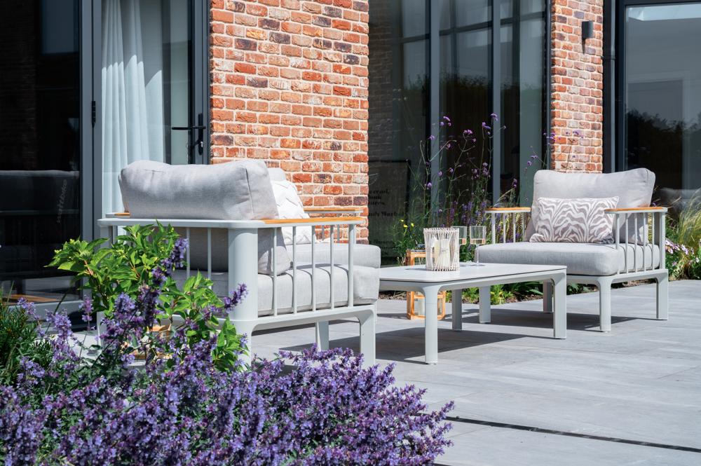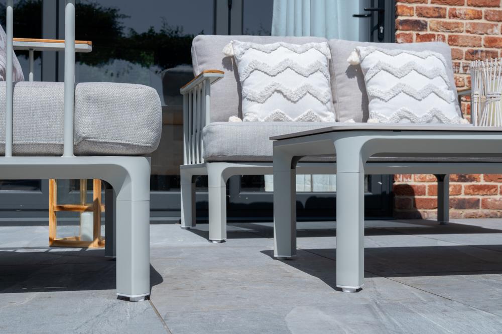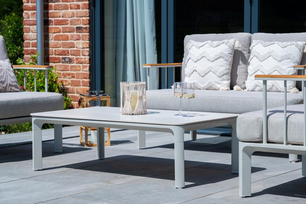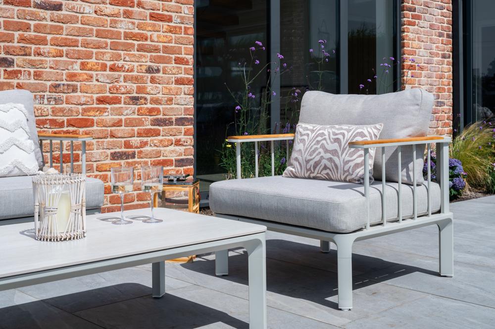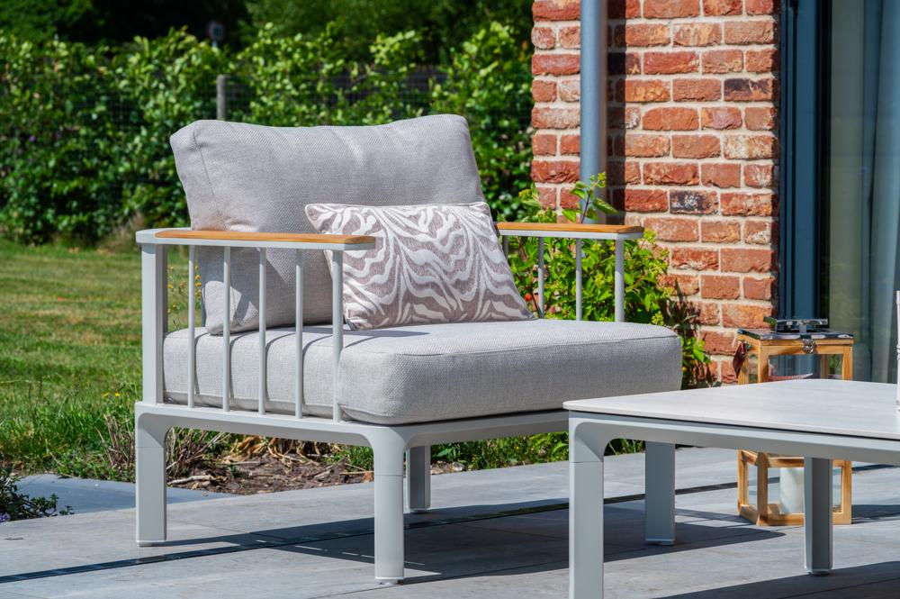 - FSC 100% certified Teak Wood in the armrests, powder-coated weather and rust resistance aluminium framing and a sintered stone table top